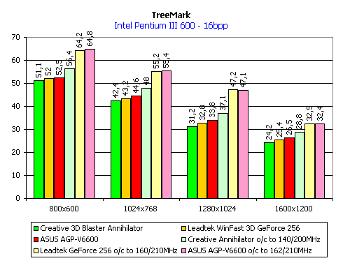 В данном тестировании также снимались показания на штатных частотах и при разгоне. Результат очевиден: по всем позициям лидирует ASUS AGP-V6600, близко к нему находится Leadtek WinFast GeForce 256. Интересно отметить, что с ростом разрешения разрыв в результатах между разными видеокартами увеличивается. Различие в скоростях между работающими на номинальных и разогнанных частотах видеокартами достигает своего максимума на самом высоком разрешении — 1600х1200.