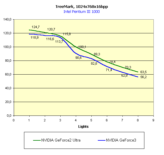На подобном незатейливом тесте карта на базе GeForce3 проигрывает GeForce2 Ultra строго в соответствии