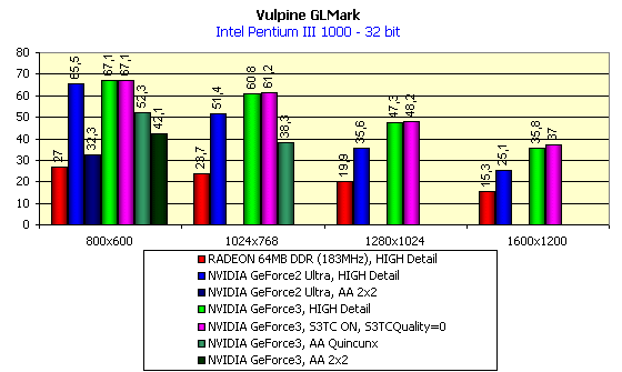 Далее мы посмотрим, как работает анизотропная фильтрация на GeForce3, и что она дает в GLMark. Сразу обращаю внимание на то, что все последующие тесты, по понятным причинам, проводились только в 32-битном цвете (уже нет смысла столь мощные акселераторы гонять в 16-битном цвете).