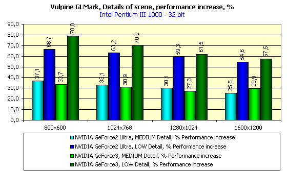 Да, можно сказать, что результаты впечатляют. Обе карты, на базе GeForce3 и GeForce2 Ultra, показали резкие скачки в производительности при уменьшении числа объектов в сцене. К сожалению, мы не знаем, сколько полигонов в сцене при том или ином уровне сложности, поэтому судить о зависимости GPU от числа полигонов на примере GLMark невозможно. Просто надо иметь в виду, что эти три уровня дают нам представление о трех градациях сложности будущих и существующих игр. Если посмотреть на скриншоты ниже, то можно понять, что High Detail — это уровень будущих и даже далеко будущих игр.