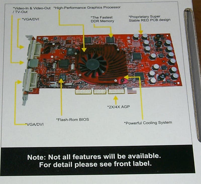 | А вот на эту упаковку прошу обратить внимание. На лицевой стороне можно только из маленькой наклейки внизу слева узнать что в коробке находится именно GeForce4 MX440. А на обороте… фотография GeForce4 Ti 4600. Хотя есть и надпись, многозначительно гласящая, что у карты внутри коробки имеются не все перечисленные функции, а за подробностями следует обращаться на лицевую сторону упаковки. Налицо вариант общей упаковки для всей серии GeForce4. Я считаю, что это нечестный способ экономить на выпуске коробки именно для GeForce4 MX. Ведь найдется немало неопытных пользователей, которые не заметят скромную наклейку слева внизу, а в остальном упаковка гласит, что в ней ПРОСТО GeForce4. С фотографией Ti 4600. Сами понимаете. Такая известная компания как Gainward могла бы и потратиться на выпуск отдельной упаковки для GeForce4 MX 440. | ![]() |