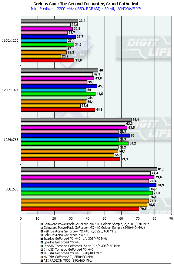 - Serious Sam: The Second Encounter v.1.05 (Croteam/GodGames) — OpenGL, мультитекстурирование, Grand Cathedral demo, настройки тестирования: quality, S3TC OFF, Trilinear