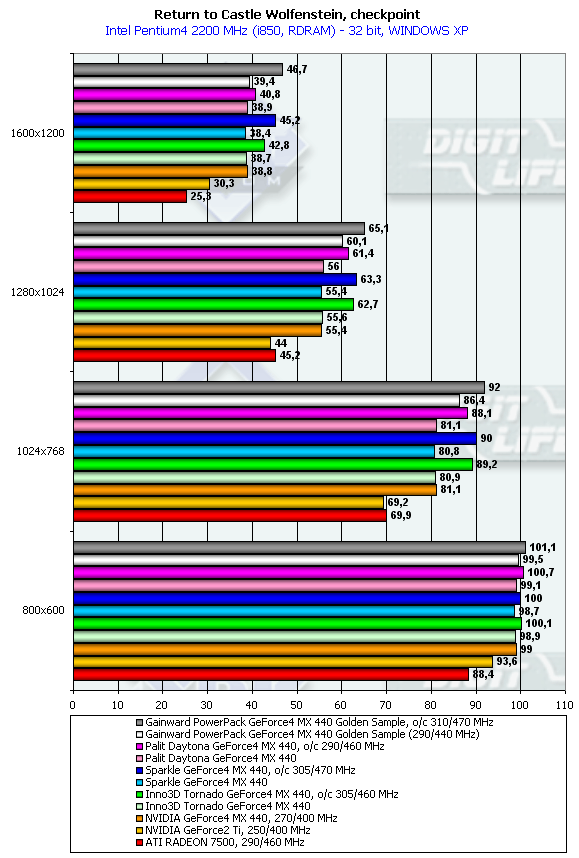 - Return to Castle Wolfenstein (MultiPlayer) (id Software/Activision) — OpenGL, мультитекстурирование, Checkpoint-demo, настройки тестирования — все на максимально возможном уровне, S3TC OFF, конфигурации можно скачать тут