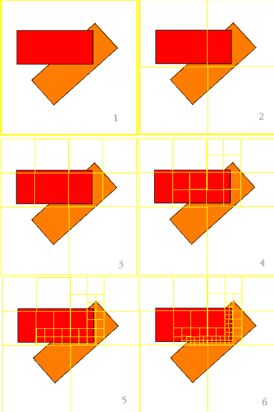 Алгоритм рекурсивного деления пространства по Варноку [Warnock69] удовлетворяет поставленному условию в достаточной мере, осуществляя поиск видимых участков изображения путем рекурсивного, четырехкратного деления тайлов, содержащих полигоны. Если обработка примитивов осуществляется от ближнего к дальнему, то алгоритм будет исследовать только те тайлы, которые содержат видимые участки полигонов. Несмотря на то, что алгоритм Варнока в целом соответствует нашему желанию работать только с видимыми частями примитивов, традиционное деление осуществляется довольно медленно, и конечном итоге проигрывает по скорости инкрементальному сканированию, за исключением случаев с очень сложными сценами. Традиционный алгоритм Варнока, впрочем, как и инкрементальное сканирование, оказываются малопригодными для обработки сцен средней сложности.