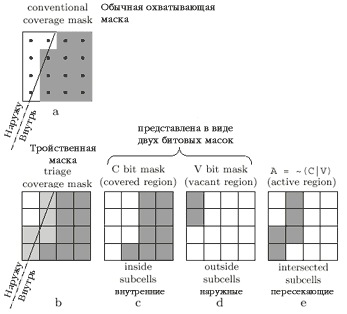 ![]() | Рисунок 1. Обычная охватывающая маска определяет единичные отсчеты сетки как наружные и внутренние (фрагмент а). Тройственная охватывающая маска определяет субъячейки как внешние, внутренние и пересекающие край полигона (фрагмент b). Будем называть их как закрытые (covered), вакантные (vacant) и активные (active). Сама тройственная маска состоит из двух битовых масок (C, V), определяющих закрытые и вакантные участки. На практике, наш алгоритм использует маски размерностью 8х8, а не 4х4, как изображено на рисунке. |
