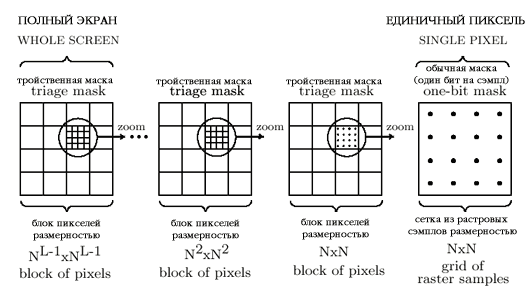 Обычные охватывающие маски реализуют две базовые функции тайлинга и определения видимости: (1) поиск маски, соответствующей обрабатываемому полигону из таблицы масок, описывающих края полигона; (2) поиск видимых сэмплов полигона внутри пикселя путем совмещения маски текущего полигона с маской пикселя, полученной при обработке предыдущего полигона (см. далее описание алгоритма). С точки зрения иерархического тайлинга, тройственные маски осуществляют те же самые операции. Разница состоит в том, что тройственные маски применяются на всех элементах иерархии изображения, а применение обычных масок ограничивается конкретным прямоугольным участком изображения, в нашем случае — пикселем. Иерархию изображения составляют уровни так называемой "пирамиды охвата", которая схематично воспроизведена на Рис. 2. (Если представить данный рисунок в трехмерной проекции, с соблюдением масштаба размеров уровней, изображение будет иметь вид пирамиды).