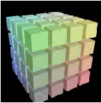 Для того, чтобы оценить производительность И.тайлинга по сравнению с традиционным инкрементальным сканированием, мы задействовали простейшую модель, состоящую из 64 кубов, обеспечивающих 192 лицевые поверхности (См. Рис.5). Рендеризация проводилась как с использованием И.тайлинга, так и с применением традиционного "алгоритма художника" т.е. методом от дальнего к ближнему, в результате чего метод инкрементального сканирования многократно переписывал каждый пиксель на своем пути. В результате И.тайлинг обеспечил рендеризацию изображения в 512х512 пикселей с фильтрацией на сетке в 4096х4096 растровых сэмплов за 0.357 секунды. Алгоритм художника за такое же время обеспечил рендеризацию сетки в 910х910 сэмплов, а протестировать его на сетке 4096х4096 мы просто не смогли ввиду тривиальной нехватки количества оперативной памяти на компьютере для формирования полноцветного RGB изображения таким способом. Проведенный пример показывает, что даже на простейших моделях для осуществления сглаживания и фильтрации И.тайлинг более привлекателен традиционного сканирования.