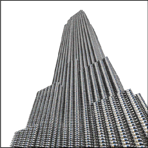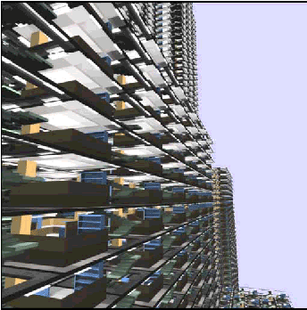 Для тестирования возможностей И.тайлинга при рендеризации сложных, плотно перекрытых сцен мы комбинировали иерархический тайлинг с иерархическим алгоритмом определения видимости (как описано в параграфе 5). В качестве тестовой модели мы применили ту же самую модель модульного здания, использованную при тестировании иерархического Z-буфера в работе [Greene-Kaas-Miller93]. В соответствии с параграфом 5.1, мы построили октаструктуру на основе структур BSP для дублирующихся модулей офисного здания. Каждая из структур BSP содержала приблизительно 16000 прямоугольников. Размножив структуры по размерам границ здания, мы получили 408 этажную модель, напоминающую Empire State Building в Нью-Йорке, состоящую из 167 миллионов прямоугольников. Рисунки 4, 6, 7 показывают получившееся здание с различных ракурсов.