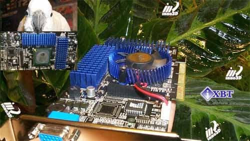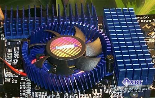 Я прошу обратить внимание на охлаждающего устройство, установленное на Inno3D Tornado GeForce3. Это комплект фирмы ThermalTake, которая уже очень хорошо известна на нашем рынке своими кулерами Golden Orb, Chrome Orb, Blue Orb. Вот последний и является главной частью этого набора, этот кулер охлаждает процессор (он показан на фото справа). Как центральный кулер и радиаторы на микросхемах памяти очень эффективно выполняют свою работу.