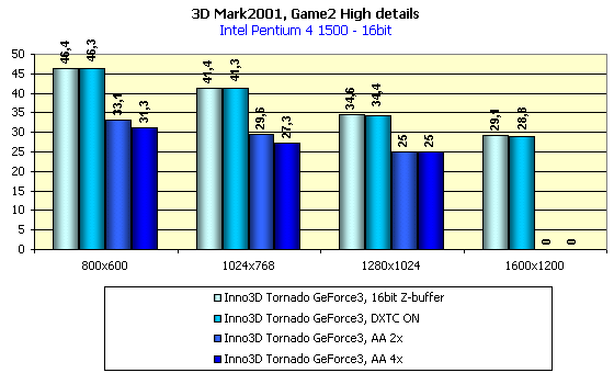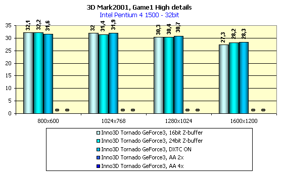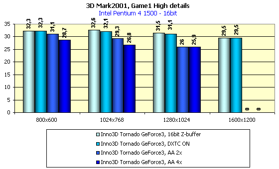 Опыт тестирования предыдущих плат на базе GeForce3 продемонстрировал очень хороший уровень качества в 2D у этих карт. И мне весьма приятно отметить, что Inno3D Tornado GeForce3 имеет весьма высокое качество изображения. То есть, в разрешении 1600х1200 при 75Гц можно очень комфортно работать при наличии большого монитора. При 85Гц в том же разрешении уже можно заметить маленький дискомфорт. Подчеркну, что качество 2D-графики сильно зависит от конкретного экземпляра карты, а также от качества и возможностей монитора.