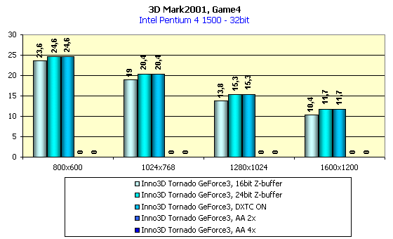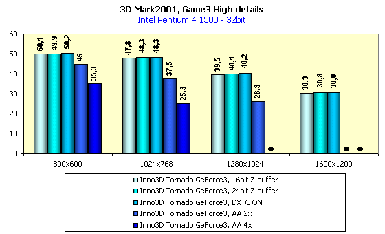 Комментировать результаты активизации анти-алиасинга, думаю, нет надобности, падение производительности находится в обычных для этого режима пропорциях. Я нарочно показал результаты тестирования при Z-буфере разных глубин. Видно, что в 32-битном цвете включение 24-битного Z-буфера подчас приводит к росту скорости относительно работы с 16-битным Z-буфером. Тут возникает недоумение, так как по логике вещей производительность при Z16 должна расти, а тут все наоборот. Вероятно, что это все же какая-то ошибка в 3DMark2001.