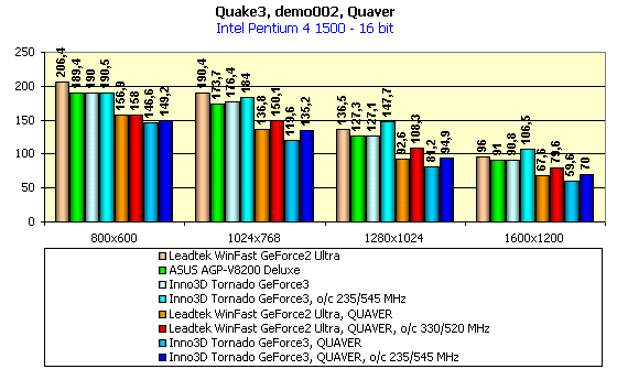 Тестирование на примере demo002 проводилось в режимах Fast (демонстрирует работу карты в 16-битном цвете) и High Quality (демонстрирует работу карты в 32-битном цвете), а на примере Quaver — при максимально возможном качестве (детализации геометрии и текстур — высшие).