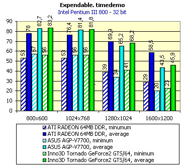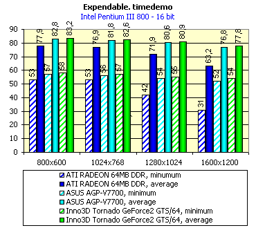Заметим, что Inno3D Tornado GeForce2 GTS/64 вплотную приблизилась по скорости к ATI RADEON 64MB VIVO, хотя так и не обогнав последнюю. Эти результаты весьма показательны для случаев использования подобных видеокарт с программными продуктами, оперирующими большими объемами текстурного материала, либо с очень сложными многополигональными объектами. Конечно же, пока игр такого плана практически еще нет, за исключением некоторых сцен в Quake3-подобных играх, либо демо-программ.