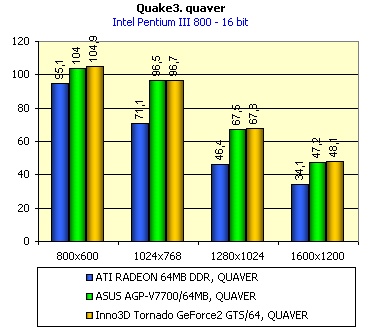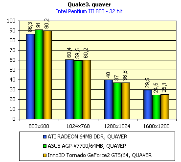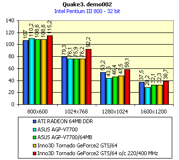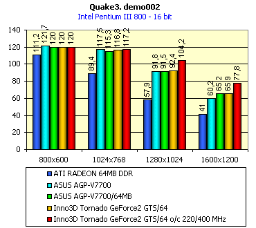 Как видим, при исследовании в играх, на которых 32-мегабайтные платы вполне довольствуются своим объемом памяти, а также пользуются возможностями AGP-текстурирования, установка 64-мегабайтной карты мало что дает. Можно считать, что даже практически ничего не дает. Однако, как мы уже убедились на примере ASUS AGP-V7700/64, если посмотреть на работу платы в том же Quake3 на уровне q3dm9, где много больших текстур, то уже видим иную картину (при тестировании все установки были на максимуме — и уровень геометрии, и уровень детализации текстур). Я просто напомню, что в 32-битном цвете, когда объемы прогоняемых через видеопамять текстур сильно превышают размер локальной памяти в 32 мегабайта, наличие 64-х мегабайт у видеокарты дает о себе знать. На нижеприведенных диаграммах видно, что Inno3D Tornado GeForce2 GTS/64 идет практически вровень с ASUS AGP-V7700/64, тем самым подтверждая полностью выводы, сделанные в обзоре по предыдущей карте.