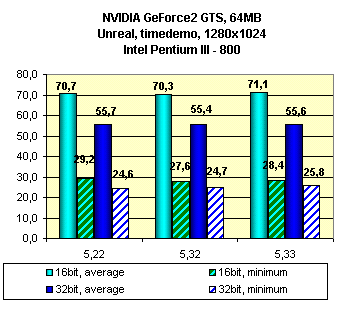 Как можно видеть, смена версий драйверов у этой карты ничего не дает. Поэтому можно выбирать любую нравящуюся версию. Из соображений надежности могу посоветовать пользоваться версией 5.22, так как это официально вышедшая версия, но вместе с тем желающим воспользоваться FSAA я рекомендую версию 5.33, так как в этой версии работа FSAA более отлажена, и падение производительности уже поменьше. В сводных диаграммах можно увидеть результаты по производительности видеокарт на этом чипсете при включенном FSAA.