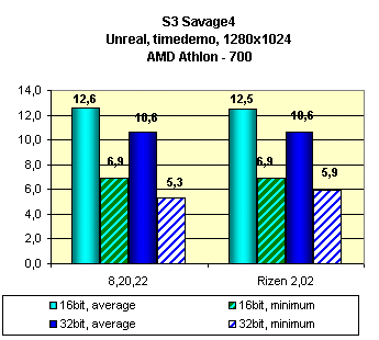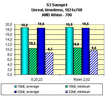 На конец июля 2000 года последняя версия драйверов от S3 — 8.20.22, BiPolar Tweaked — 1.17, Rizen Tweaked 2.02. Эти версии и представлены. К сожалению, запустить данную видеокарту на стенде на базе i815, так и не удалось. Ни одна версия драйверов не запустилась корректно на этом стенде. Поэтому показатели производительности сняты были на стенде на базе AMD-750. Игра Unreal тестировалась в режиме Direct3D ввиду постоянного зависания при работе в API S3 Metal.