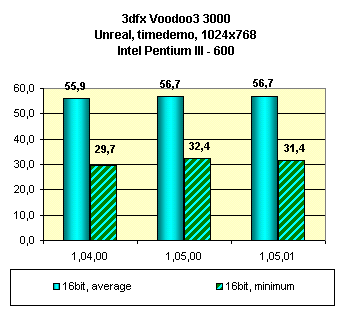 Как мы видим, последняя версия драйверов от 3dfx 1.05.01 дает приросты по скорости, правда не везде. Хочу также отметить возросшее качество картинки в 3D, которое мы можем иметь начиная с версий 1.05.00. Тем не менее, артефакты имеются. Прежде всего хочу отметить отсутствие честной трилинейной фильтрации в играх типа Quake3 даже при выключении мультитекстурирования.