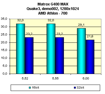 Ситуация очень похожа на ту, что видим у карты на чипсете G400. Как можно видеть, последняя версия драйверов 6.00 ничего нового не принесла, скорость осталась на прежнем уровне (или даже упала), артефакты в виде полосатостей на световых бликах присутствуют на всех версиях ICD OpenGL. Работу TurboGL читатель может оценить на странице,
