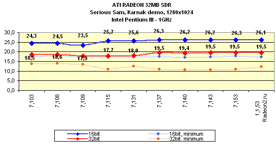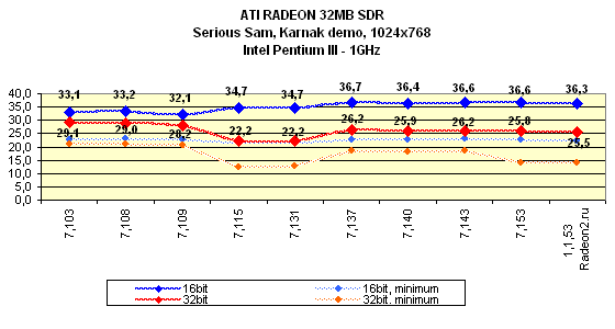 Падение производительности в Serious Sam на предыдущих версиях драйверов вызвано тем, что ранее мы использовали установки, выставляемые игрой по умолчанию в режиме Quality, однако при работе в 32-битном цвете все же не все эффекты имели заданную глубину цвета, поэтому при новом тестировании мы стали принудительно задавать 100-процентное использование соответствующих глубин цвета во всех настройках.