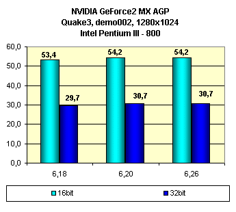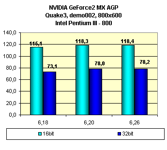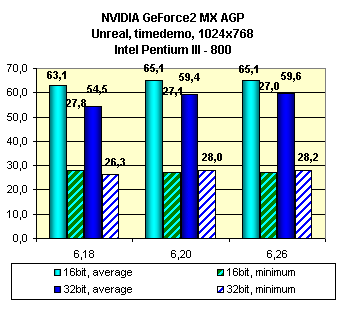 Видно, что последняя версия 6.26 выгодно отличается от предшественников, принеся прирост по скорости в 32-битном цвете. Поэтому можно рекомендовать использовать последнюю версию драйверов из новой серии — 6.26. Правда с некоторыми оговорками, так как с новой версией появилось одно нарекание на качество в 3D на КТ133-базируемом стенде (речь идет об игре Unreal Tournament в Direct3D режиме):
