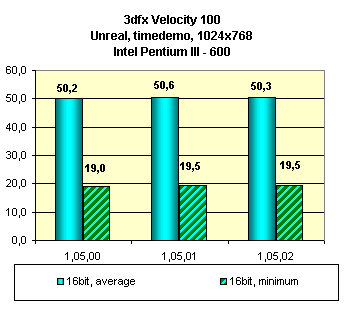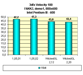 Уже более года минуло с тех пор, как вышла в свет эта карта, и мы следим за феноменом маленькой карты Velocity 100, которая подчас спорит по скорости с маститыми изделиями. Новая версия драйверов 1.05.02 мало что принесла этой карте с точки зрения производительности в Direct3D-играх, а вот мини-драйвер WickedGL 2.12 и особенно 2.20 показал неплохой прирост в Quake3 относительно ICD OpenGL от 3dfx, однако на этом же драйвере мы видим падение в игре FAKK2. Это явление вполне объяснимо. Тестирование в Quake3 в 16-битном цвете проходит при вполне вольготных для 8-ми меговой карты условиях (средние уровни как геометрии, так и детализации текстур), когда как в FAKK2 при тестировании уровень качества графики поставлен в High. Если ICD OpenGL еще с этим справляется, то WickedGL-драйвер, используя Glide-код, уже с большими текстурами "захлебывается". Тем не менее, я хочу отметить возросшее качество картинки в 3D, которое мы можем наблюдать по мере эволюции этого драйвера. Если раньше это было сплошное "размывание" картинки, то теперь присутствует четкость линий и т.п. И все же артефакты имеются. Прежде всего это отсутствие честной трилинейной фильтрации в OpenGL-играх даже при выключении мультитекстурирования (разумеется в случае включенного второго текстурного модуля на этой карте). Этот факт жесткого включения мультитекстурирования косвенно подтвердила и сама 3dfx. Почему косвенно? Потому как речь шла о Voodoo5, но в сходной ситуации. Однако я могу предположить, что жесткое включение мультитекстурирования в ущерб трилинейной фильтрации осуществлено и в драйверах от 3dfx. Кстати, такую же картину нам демонстрирует и WickedGL-драйвер.