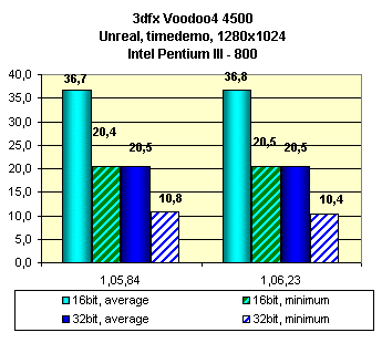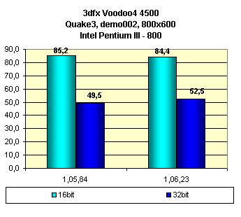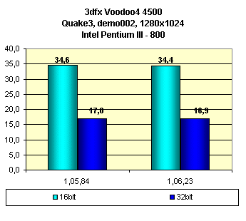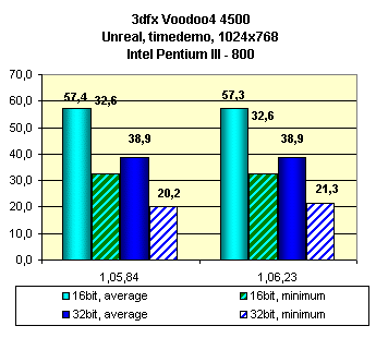 Как видим, новая версия 1.06.23 в ряде случаев оказалась похуже в плане производительности. Поэтому можно рекомендовать остановиться на версии 1.05.84. Хотя, подчеркну лишний раз, что в данный момент мы рассматриваем эмуляцию Voodoo4 4500 на базе Voodoo5 5500, показатели "настоящей" карты могут быть несколько иными. Когда мы получим в нашу лабораторию эту плату, то произведем перетестирование и коррекцию результатов.