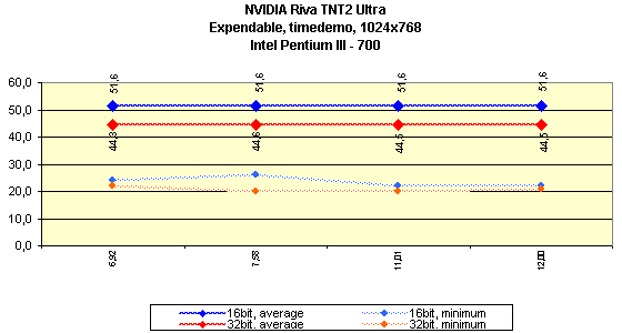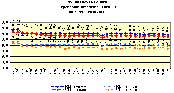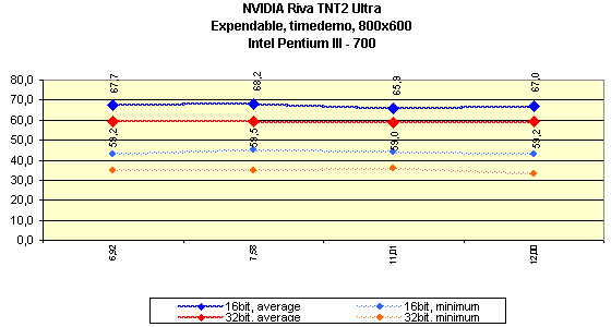 Можно видеть, что установка более старых версий драйверов, даже 2.* вполне оправдана, хотя разница по производительности и не столь значительна, если не считать некоторых "провалов" на 6.11-6.20-х версиях. Я хочу обратить внимание пользователей на версии 7.16 и 7.17. Это очень сырое программное обеспечение, которое не тянет даже на звание бета-версии. Как видим, в случае использования этих версий драйверов Quake3, как и другие OpenGL приложения, на данной карте просто не работает, а Direct3D-игры показывают сильное падение по скорости. К тому же на этих версиях замечено очень много артефактов визуального плана. На драйверах 7.83 и 7.91 зависает игра Unreal Tournament (Direct3D).