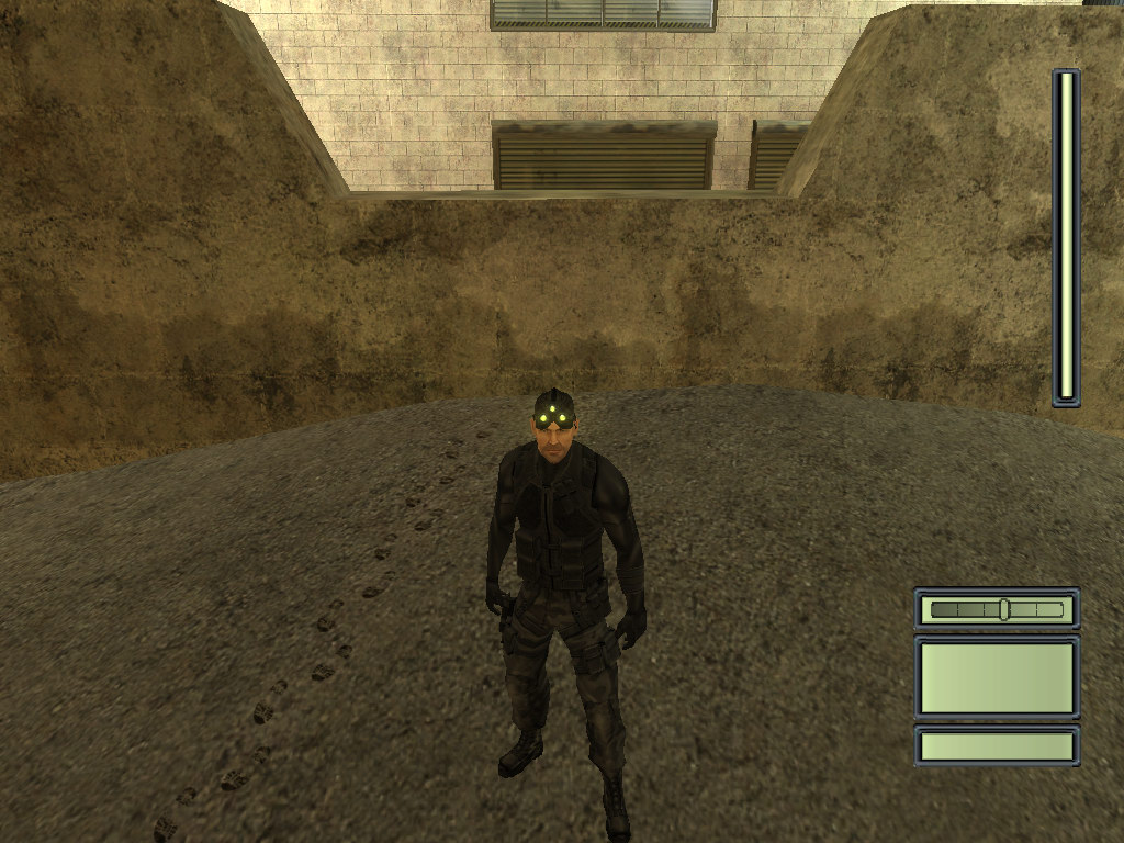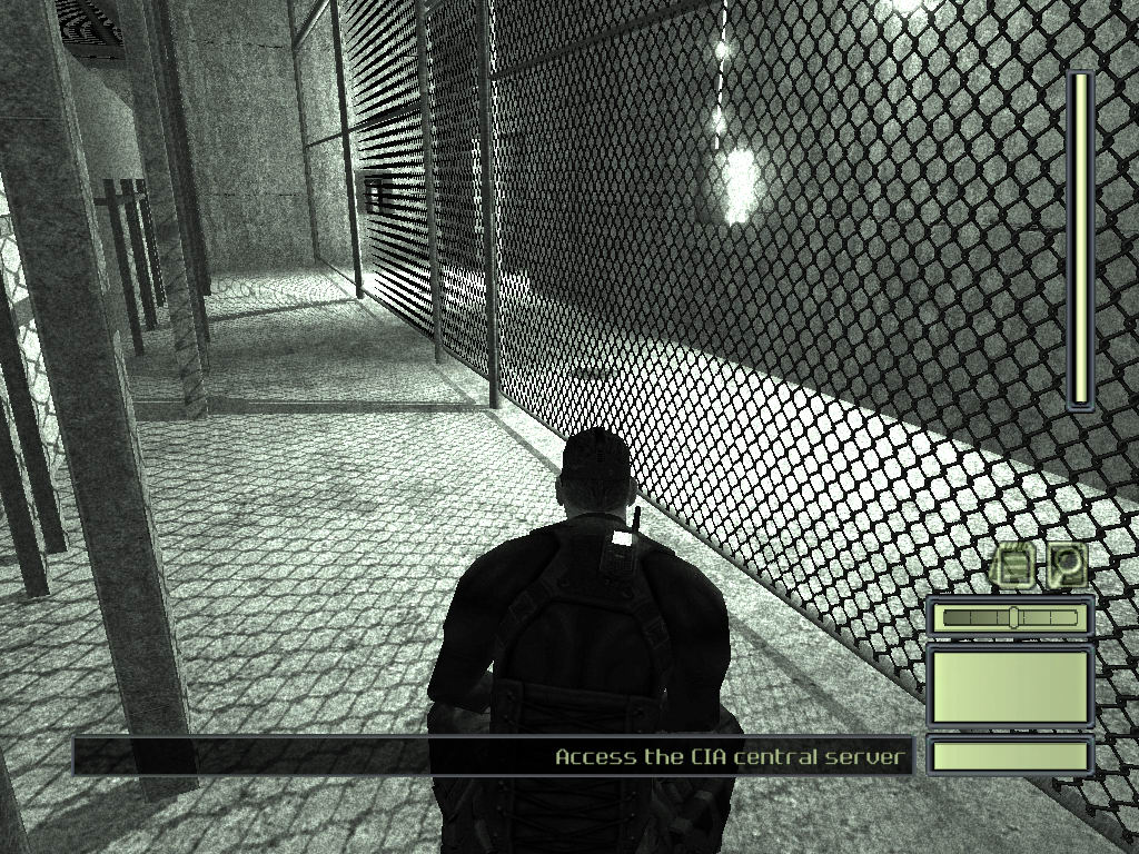 | Необходимо помнить, что на видеокартах от NVIDIA, начиная с GF3 и выше, игра использует технологию shadow mapping, позволяющую достичь существенно более высокой детализации теней (по крайней мере, в этой игре). На картах уровня GF4MX и на всех без исключений Radeon используются projected textures существенно менее высокого разрешения. Разница отлично видна на скриншотах качества. Но что интереснее всего: особенности shadow mapping в SC приводят к тому, что на GF3+ игра заметно более светлая, что автоматически делает ее заметно более сложной — уже не так просто с умным видом красться по теням. На скриншотах опять же видна разница в освещении одного и того же места по «светомеру» в правом нижнем углу. |