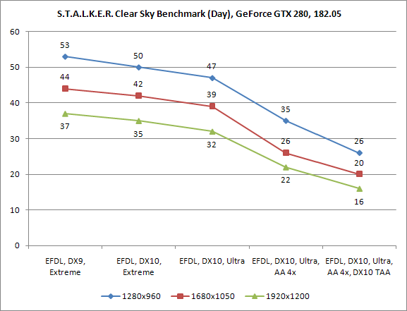Причём, наибольшее падение наблюдается при включении антиалиасинга, что позволяет заподозрить либо саму функцию в низкой эффективности реализации в этой игре (из-за особенностей своих алгоритмов движок S.T.A.L.K.E.R. требует отдельных усилий для использования MSAA — антиалиасинг «официально» вообще доступен лишь в DX10-рендерере, хотя на видеокартах NVIDIA вы можете его форсировать и под API DX9); либо видеокарту GTX 280 в нехватке ПСП.