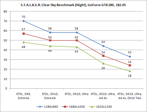 Несколько видоизменился и профиль графиков: пропало падение производительности при переходе от Extreme к Ultra-пресету под API DX10 — вероятнее всего, дело в том, что ночью тени от солнца в любом пресете качества не отрисовываются.