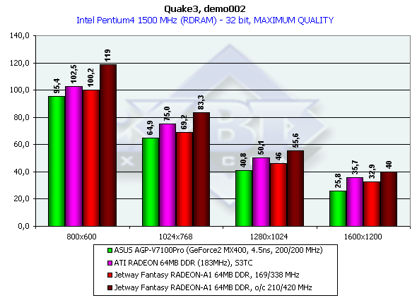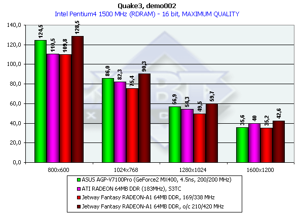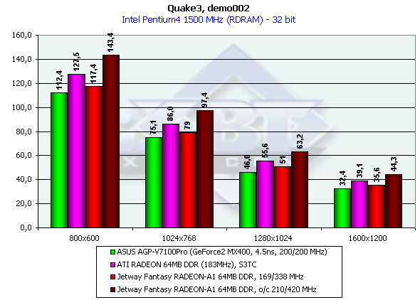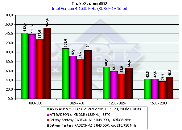 Как и ожидалось, производительность нашего исследуемого образца оказалась немного ниже, чем у более скоростного по частотам соперника от ATI. И если в 16-битном цвете карты на RADEON проиграли конкуренту от NVIDIA, то в 32-битном цвете Jetway Fantasy RADEON-A1 64MB DDR оказалась в выигрыше (не считая разгона: в этом случае плата на GeForce2 MX400, даже работающая изначально на повышенных частотах, безнадежно отстала).