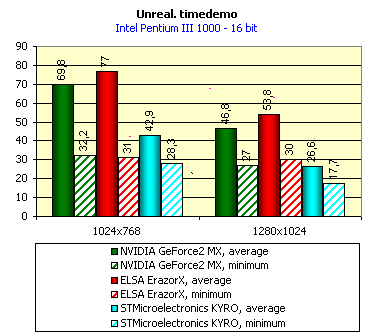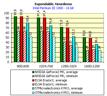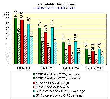 Нетрудно заметить, что карта на базе KYRO проиграла обоим своим конкурентам практически во всех тестах, кроме Expendable в 32-битном цвете. Вывод простой: при данном состоянии драйверов видеокарты на чипсете KYRO практически не представляют собой серьезного конкурента платам на базе NVIDIA GeForce2 MX.