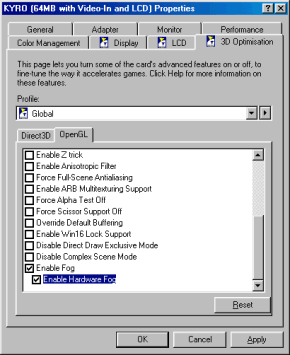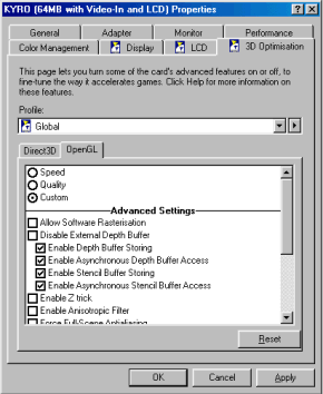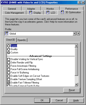 Компания STMicroelectronics уже выпустила несколько бета-версий драйверов для KYRO. При тестировании я использовал последнюю версию 4.44 (версия BIOS 1.80, хотя существует и версия 1.81, однако ее перепрошивка приводит к крайне нестабильной работе карты). Именно проблема с отсутствием нормальных драйверов объясняет то, что обзор вышел только сейчас.