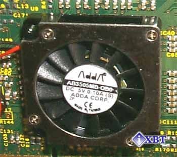 На данной плате установлен активный кулер, который можно встретить на очень редких видеокартах типа Canopus Spectra. Маленький, но высококачественный вентилятор осуществляет прогонку воздуха вдоль видеокарты (на радиаторе есть соответствующие щели).