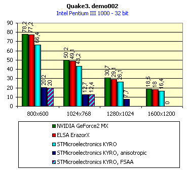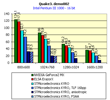 Правда, общее падение скорости при использовании трилинейной фильтрации у карты на базе KYRO просто ужасающе. Это не удивительно, т.к. у KYRO всего два пиксельных конвейера и два модуля текстурирования, а это значит, что мультитекстурирование и трилинейная фильтрация не могут без ужасных потерь в скорости работать одновременно. Тоже самое относится и к падению производительности при включении анизотропной фильтрации (о качестве ее реализации будет сказано ниже). Про скорость в режиме FSAA (Anti-aliasing) говорить просто не хочется, так как скорость настолько низкая, что поддержку этой функции можно считать заявленной лишь для галочки.