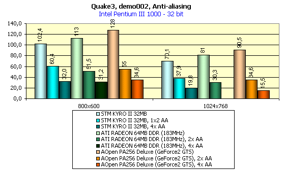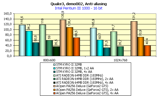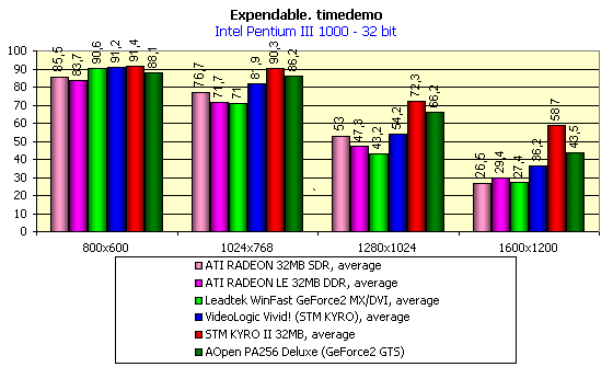 Для сравнительного анализа были использованы результаты следующих видеокарт: ATI RADEON 32MB SDR, ATI RADEON 32MB DDR, Leadtek WinFast GeForce2 MX/DVI, VideoLogic Vivid! (KYRO), AOpen PA256 Deluxe (GeForce2 GTS).