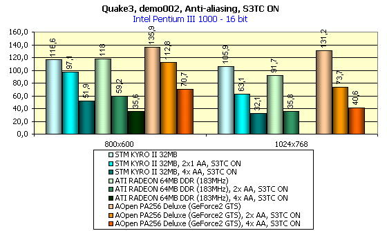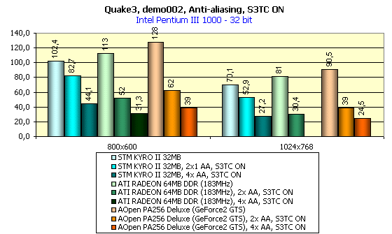 Наблюдается сильное снижение скорости, сводящее на нет всю играбельность. Справедливости ради отметим, что подобная картина преследует и все остальные ускорители, только GeForce3 с его Quincunx играбелен в разрешении 1024х768х32, да GeForce2 ультра, в режиме 16 бит. И даже новая архитектура KYRO II не спасает — увеличение количества закрашиваемых пикселей (пускай и эффективно закрашиваемых) в 4 раза (при АА 2х2) дает о себе знать. Двухконвейерный чип просто не в состоянии обработать этот колоссальный массив с приемлемой скоростью. У того же RADEON положение еще хуже. Только GeForce2 GTS в 16-битном цвете при активном АА выглядит лидером, как мы и предполагали. А вот в 32-битном цвете при работающем АА все карты практически равны, но KYRO II чуть впереди — ему не надо хранить в памяти буфер кадра увеличенного размера. Посмотрим что происходит при активизации S3TC: