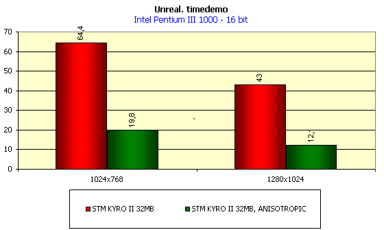 И еще. Сравните производительность KYRO II в 16- и 32-битном цвете при активной S3TC. Разницы почти нет. Тайловая архитектура при помощи S3TC практически полностью освобождает чип ограничений в лице пропускной способности видеопамяти (как известно, внутри чипа KYRO оперирует с 32-битным цветом во всех случаях) и упирается только в тактовую частоту чипа и число конвейеров / текстурных модулей.
