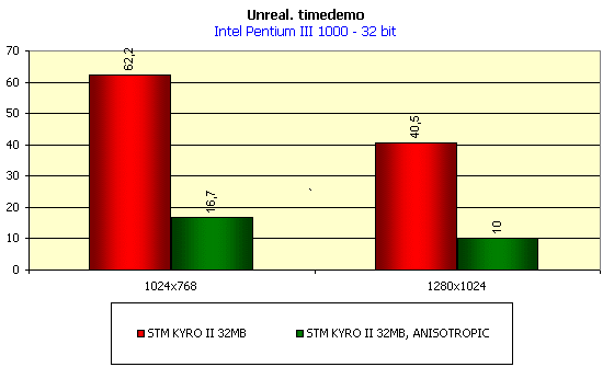 Раз уж речь зашла о режиме тестирования с наилучшим качеством, то нелишне будет напомнить, что в данном тесте принимает участие трилинейная фильтрация. Мы знаем, что у KYRO/KYRO II она реализована честно, а не через аппроксимацию. Также хорошо известно, что при подобной архитектуре конвейеров (2 конвейера и по одному TMU на каждом), например, у NVIDIA Riva TNT2 при условии принудительного включения честной трилинейки наблюдается просто катастрофическое падение производительности. Поэтому давайте посмотрим, как обстоит дело при отключенной трилинейной фильтрации в 32-битном цвете: