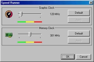 Эта закладка представляет собой утилиту по разгону видеокарты, где можно повышать частоту работы чипсета до 180 МГц, а памяти — до 370 МГц: