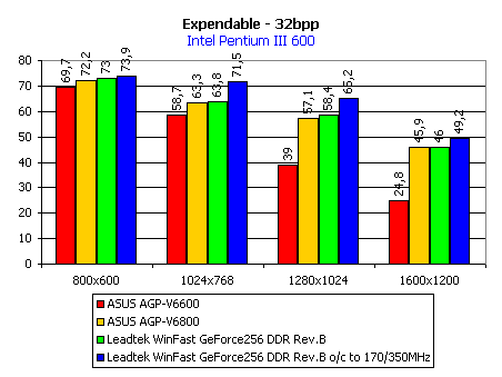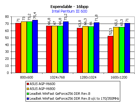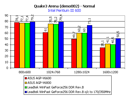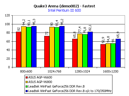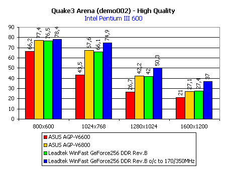 Этих инструментов вполне достаточно для того, чтобы показать производительность видеокарты. Для наглядности на диаграммах приведены скоростные показатели еще двух видеокарт на GeForce 256: ASUS AGP-V6600 с памятью типа SDR SDRAM и ASUS AGP-V6800 с памятью типа DDR SDRAM. Также мы покажем работу видеокарты Leadtek WinFast GeForce256 DDR rev.B и при разгоне.