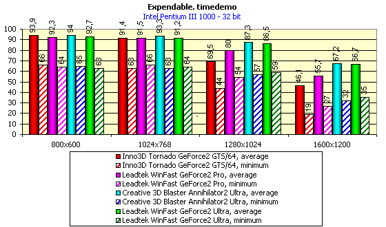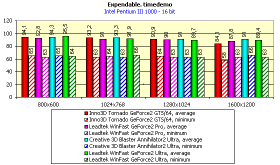 Результаты показывают, что в 16-битном цвете везде производительность видеокарты "уперлась" в частоту центрального процессора, и даже мощности 1 ГГц процессора недостаточно для реализации потенциала GeForce2 Ultra (хотя возможно, что данный тест Expendable уже себя исчерпал, и при дальнейшем росте частот CPU прирост будет незначительным). Играбельность находится на очень высоком уровне везде, поэтому комментарии излишни.