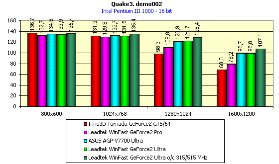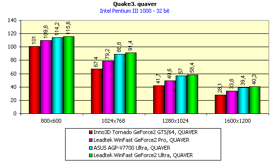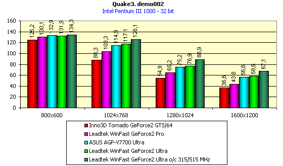- В целом, прирост по скорости по сравнению с картами на базе GeForce2 GTS весьма сильный, в 32-битном цвете разрешение 1600х1200 становится играбельным практически во всех современных играх;