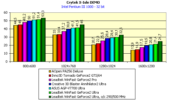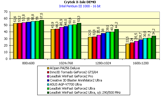 - Crytek X-Isle — игровой тест, демонстрирующий производительность Hardware TCL (T&L) в OpenGL при использовании всех последних наработок NVIDIA в 3D-графике при наличии очень сложной графики (это нам дает возможность оценить приспособленность современных акселераторов от NVIDIA к будущим тяжелым играм).