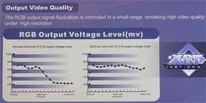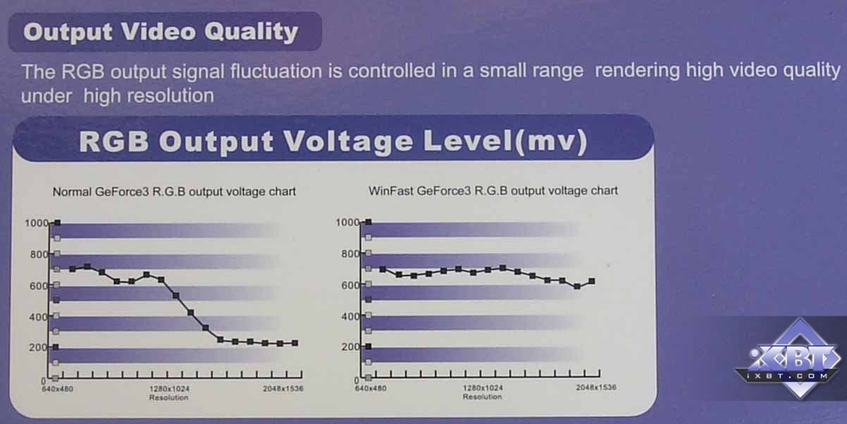 Но на этом особенности Leadtek WinFast GeForce3 TDH не заканчиваются. Давайте посмотрим на оборотную сторону коробки из-под платы (фотография справа). Согласно этому утверждению, новую ревизию коснулась модернизация не только в плане установки Hardware Monitoring, но и в части улучшения 2D-качества. Как следует из приведенных графиков, у обычных видеокарт на базе GeForce3 с ростом разрешения падает вольтаж (в миллиВольтах) у выходного RGB-сигнала. Улучшенная формула снабжения питанием Leadtek WinFast GeForce3 TDH способствует тому, что у новой карты такого падения не наблюдается. Правда это или нет — посмотрим при анализе результатов тестирования.