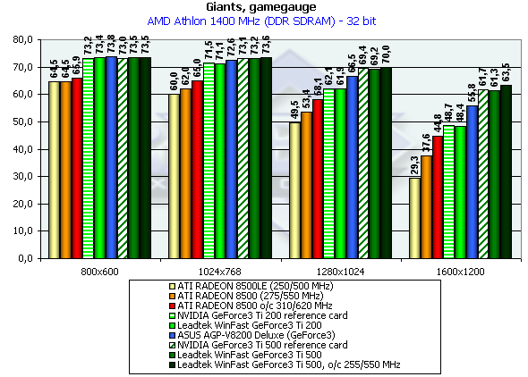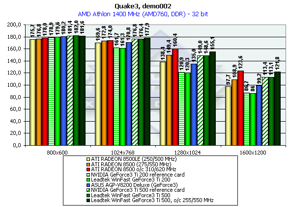 В этом тестировании в целом картина схожа с предыдущей, однако анализ исследований на базе платформы Pentium4 1500 показал, что здесь положение семейства Titanium заметно лучше, чем RADEON 8500, а вот тесты на платформе Athlon 1400 можно сказать, разочаруют сторонников продукции NVIDIA. Однако, для них не все потеряно.