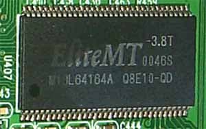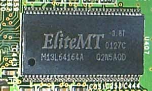 Микросхемы памяти марки EliteMT, время выборки — 3.8 ns, что соответствует примерно 260(520) МГц. Как я уже выше писал, все видеокарты на базе Ti 500 имеют память, работающую на частоте 250 (500) МГц. Казалось бы, когда для работы на частотах 230 (460) МГц используется такая же память, то логично ожидать установку на Ti 500 более быстрой памяти (как например, мы могли видеть на примере эталонной карты от NVIDIA, на которой установлены микросхемы со временем выборки 3.5 ns). Однако, как по соображениям удешевления стоимости изготовления плат вряд ли производители будут устанавливать такую очень дорогую память, к тому же, скорее всего, склады у компаний-производителей наполнены комплектами 3.8 ns памяти для изговления GeForce3-карт. Судя по всему, последние снимаются с производства, и отныне производиться будут только Ti 200/500.
