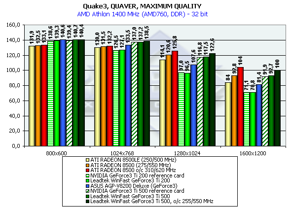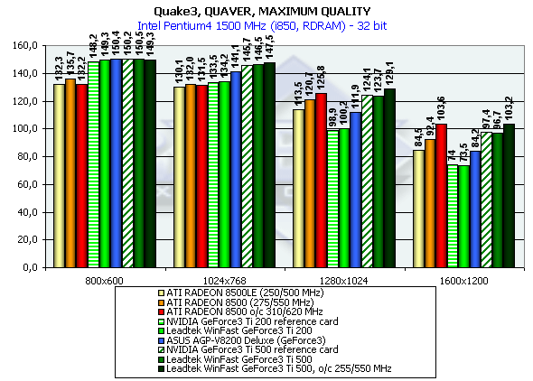 Как видим, видеокарты от Leadtek полностью соответствуют своему классу, и их производительность практически не отличается от той, что выдали эталонные карты от NVIDIA (заштрихованные столбики на диаграммах). Как и следовало ожидать, места между Ti 200, GeForce3, Ti 500 картами распределились в полном соответствии с частотными режимами работы плат. Что касается соперничества с ATI RADEON 8500, то здесь уже не так гладко и приятно для новой линейки от NVIDIA. Отчетливо видно, что младшая модель RADEON 8500LE находится на уровне GeForce3, что выше, чем может дать Ti 200. Особенно это заметно при тестировании на платформе Athlon 1400. На этой же платформе ATI RADEON 8500 почти догнал Ti 500, имея при этом намного меньшую стоимость.