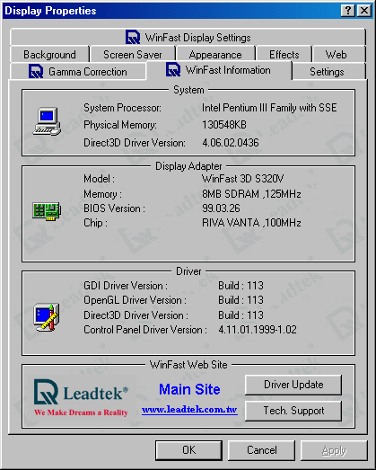 Теперь рассмотрим процесс инсталляции видеокарты Leadtek WinFast 3D S320V. Драйвера, поставляемые с ней, установились без осложнений. В настройках дисплея появился ряд новых закладок, в том числе с информацией о данной плате: