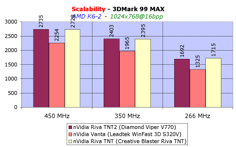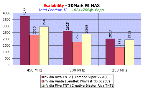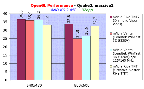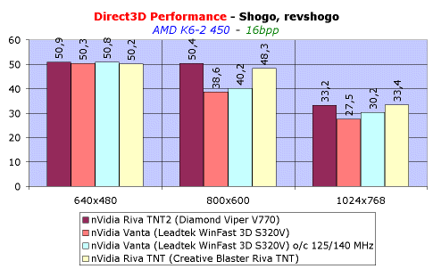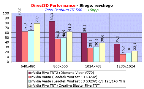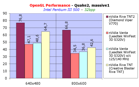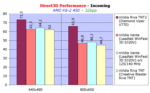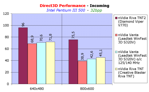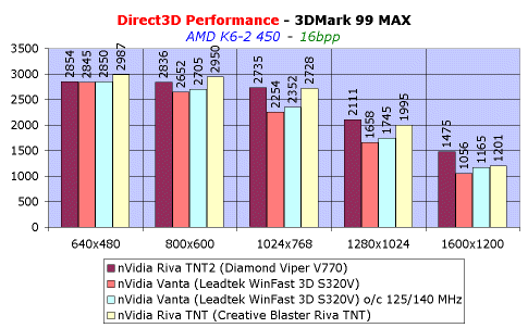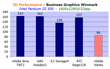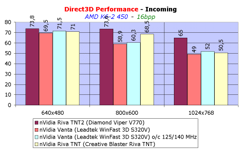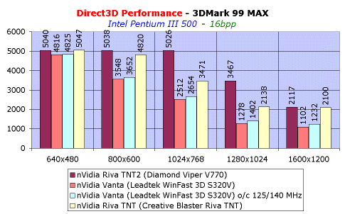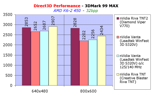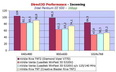 Теперь рассмотрим производительность Vanta в 3D. В рекламе нам обещают, что ядро у Vanta то же, что и у TNT2, за исключением работы с памятью (64 битная шина, вместо 128-битной у TNT2 и TNT). Посмотрим, как сказалось это ограничение на производительности.